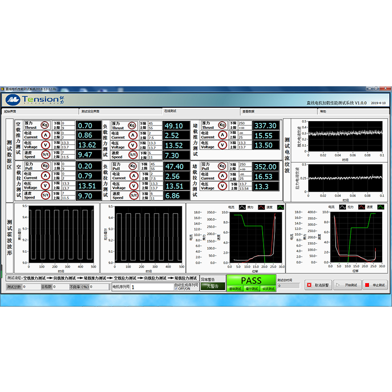 C0-MTSF-2800LH該系統(tǒng)采用伺服電機(jī)加載檢測(cè)被測(cè)電機(jī)在空載與負(fù)載狀態(tài)下的推力與拉力,包括電機(jī)速度、電壓、電流、行程等參數(shù),以及電機(jī)在堵轉(zhuǎn)下的電流與推拉力,同時(shí)在測(cè)試過(guò)程中可以檢測(cè)電機(jī)的電流紋波及霍爾信號(hào),整套測(cè)試軟件實(shí)在LABVIEW環(huán)境下開(kāi)發(fā)的,具有友好的測(cè)試界面與圖形分析功能,可以同時(shí)計(jì)算并顯示多個(gè)參數(shù)(推拉力、轉(zhuǎn)速、移動(dòng)距離、電壓電流等), 系統(tǒng)將工程師與操作員界面分開(kāi),便于管理,測(cè)試數(shù)據(jù)可以查詢、儲(chǔ)存并可以下載,可以根據(jù)客戶的要求生成特定的報(bào)告格式。