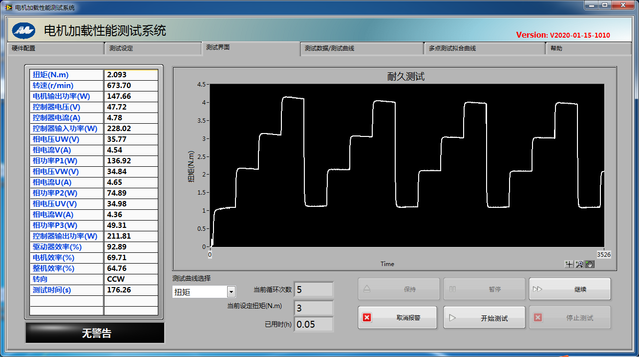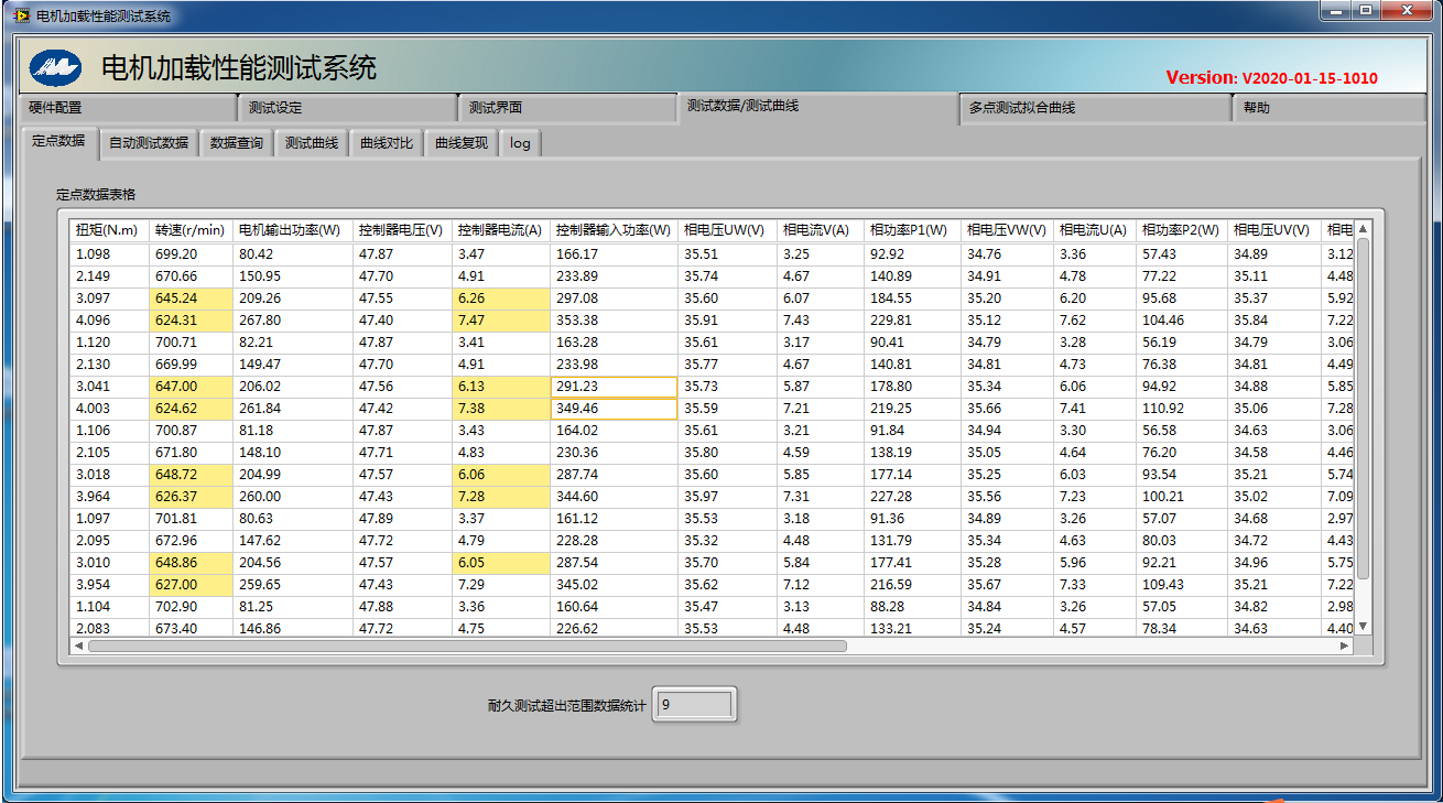 深圳某汽車制造廠定制的水泵電機(jī)綜合性能測(cè)試系統(tǒng)C0-MTHD284BYD是一套用于測(cè)試無刷電機(jī)的前端直流電壓、電流、轉(zhuǎn)速、轉(zhuǎn)矩、功率p1、p2、p3、效率,以及無刷電機(jī)驅(qū)動(dòng)器功率分析。測(cè)試結(jié)果匯總包含空載點(diǎn)、堵轉(zhuǎn)點(diǎn)、最大轉(zhuǎn)矩點(diǎn)、最大輸出點(diǎn),最大功率點(diǎn)、額定點(diǎn)(用戶自己定義轉(zhuǎn)矩),本套系統(tǒng)配有3個(gè)測(cè)功機(jī)(300mNm/3Nm/28Nm)且三個(gè)測(cè)功機(jī)之間可以通過轉(zhuǎn)換器與上位機(jī)控制實(shí)現(xiàn)自由轉(zhuǎn)換,通過PA2000mini 功率分析儀采集電機(jī)的扭矩轉(zhuǎn)速及驅(qū)動(dòng)器的輸入輸出電壓電流,軟件是根據(jù)客戶的需求進(jìn)行定制化開發(fā),整套系統(tǒng)交付客戶使用后獲得客戶的高度好評(píng)。
