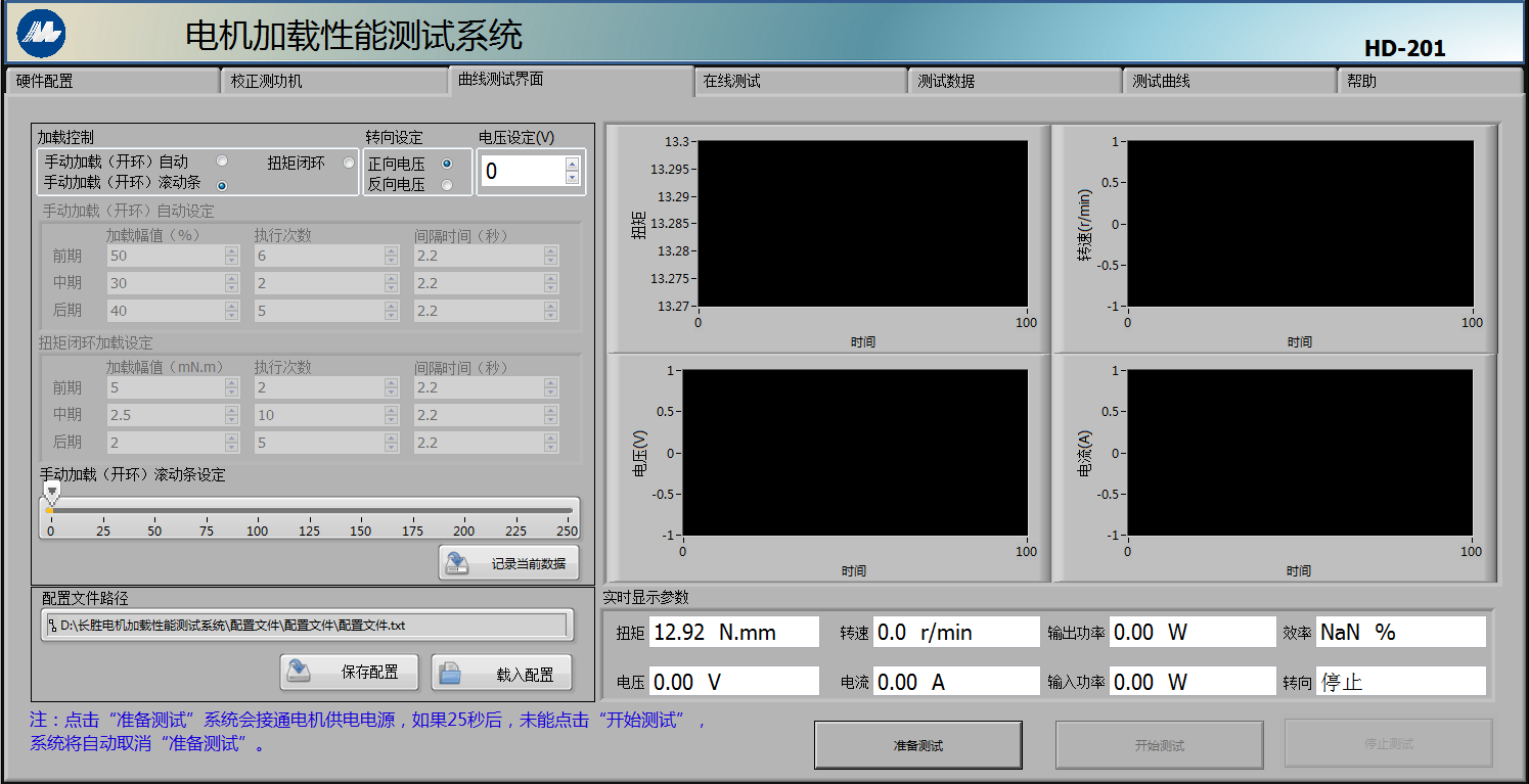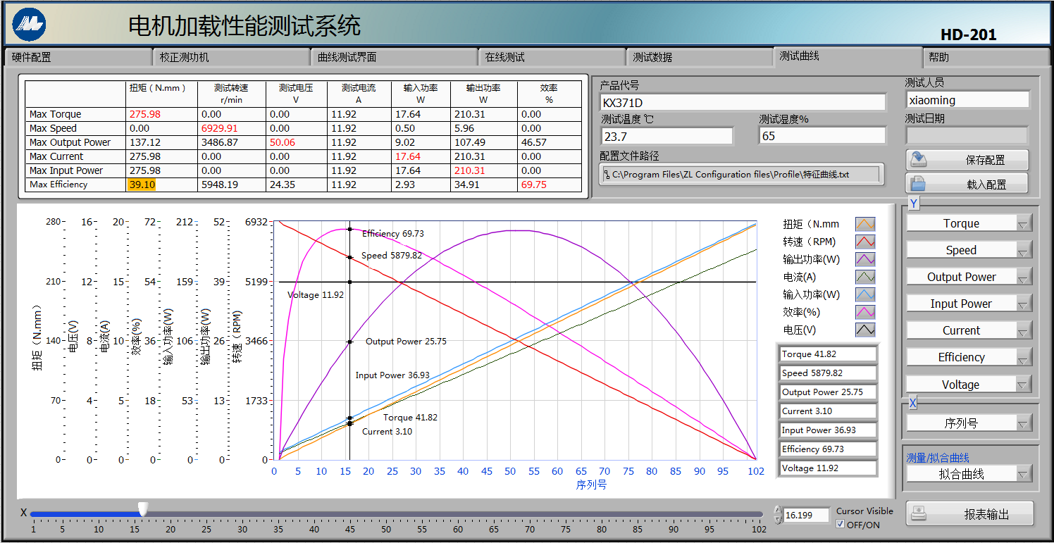 4.測試軟件用LABVIEW編寫,具有特色的測試與圖形繪制功能,可以計算并顯示多個參數(扭矩,轉速,輸出功率,電壓,電流,輸入功率,效率,轉向等)